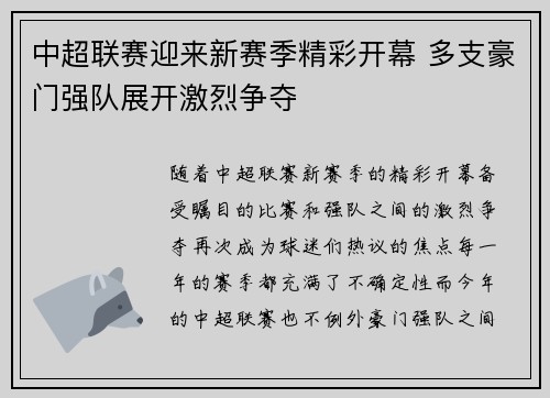 随着中超联赛新赛季的精彩开幕,备受瞩目的比赛和强队之间的激烈争夺再次成为球迷们热议的焦点。每一年的赛季都充满了不确定性,而今年的中超联赛也不例外。豪门强队之间的竞争,球员转会的变化,战术体系的演变,甚...