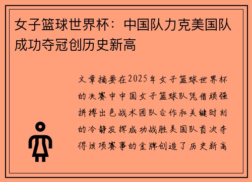 文章摘要:在2025年女子篮球世界杯的决赛中,中国女子篮球队凭借顽强拼搏、出色战术、团队合作和关键时刻的冷静发挥,成功战胜美国队,首次夺得该项赛事的金牌,创造了历史新高。中国队的这次胜利,不仅打破了美...