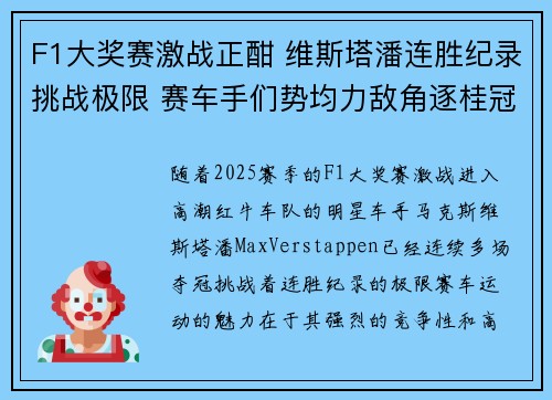 随着2025赛季的F1大奖赛激战进入高潮,红牛车队的明星车手马克斯·维斯塔潘(Max Verstappen)已经连续多场夺冠,挑战着连胜纪录的极限。赛车运动的魅力在于其强烈的竞争性和高难度的挑战,而今...